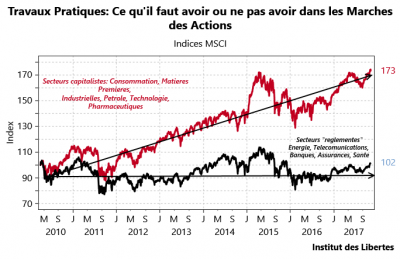 Mais je ne dis pas cela, comme c’est trop souvent le cas, par pure critique des entreprises semi-publics. Je ne fais qu’analyser les données objectivement. Et je me fais aujourd’hui l’écho de l’économiste Charles Gave. Dans un billet fort intéressant, l’économiste nous démontre, chiffres à l’appui qu’il vaut bien mieux acheter des actions dans l’économie libre que dans l’économie semi-privée. [3] Le graphique ci-dessous illustre ces différences de résultats de façon frappante. Des actions dans les secteurs vraiment privés vous rapportent 73 points en huit ans alors que les actions dans le secteur quasi public ne vous en rapporte que 2 ! Moralité : Si vous voulez être actionnaire, ne soyez pas actionnaire de l’État Misez sur les gens qui enrichissent le monde pas sur ceux qui vivent à son crochet. On peut très bien argumenter que ces entreprises quasi-publics sont nécessaires et ne peuvent pas réaliser les mêmes performances que le reste de l’économie car elles rendent un « service public ». D’accord, on peut en débattre (une autre fois). Mais je me place ici du point de vue de l’investisseur. Que les résultats médiocres des entreprises quasi-publiques soient justifiés ou non, vous voulez mettre votre argent là où on saura le multiplier. Sinon, autant en faire don directement à l’État ! À votre bonne fortune, Le Vaillant petit économiste Sources [1] [2] https://www.60millions-mag.com/2017/03/14/factures-d-electricite-nouveau-rattrapage-tarifaire-chez-edf-11038 [3] http://institutdeslibertes.org/nouvelle-lecon-sur-les-facons-de-gagner-de-largent-sans-travailler-mais-en-reflechissant/ [archive] |