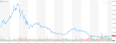 Et lorsque j’investis, je vérifie ça de très près. Si vous regardez bien la manière dont fonctionnent les différentes parties de notre économie, vous verrez que les différences sont grandes. Certains secteurs, comme l’informatique ou le luxe, sont très libres. C’est-à-dire qu’ils peuvent mener leurs affaires comme ils l’entendent. Ils doivent, bien-sûr, rester dans les limites de la loi. Cependant, le gouvernement n’intervient pas, ou peu, dans leurs activités. Les réglementations sont faibles et l’État n’est pas actionnaire. C’est là qu’on trouve de la croissance. En revanche, d’autres domaines sont largement sous la férule de l’État et de réglementations complexes. Ainsi, une société comme EDF peut être considérée comme quasi étatique. Créée en 1946 à la suite de la nationalisation de nombreuses entreprises privées, elle (re)devient société anonyme en 2004 afin d’ouvrir son capital et de s’introduire en bourse. Mais c’est l’État qui devient actionnaire principal, donc autant dire que niveau gestion, rien ne change ! Bien qu’elle soit une entreprise privée, sur le papier, la réalité est que le secteur public s’immisce tellement dans ses activités que sa marge de manœuvre est réduite comme peau de chagrin. En bourse, c’est le film d’horreur : Mais EDF n’est pas la seule. La France, comme de nombreux autres pays d’ailleurs, a engendré un certain nombre de mastodontes qui ne créent pas beaucoup de valeur. Ils génèrent même des coûts inutiles pour la collectivité.