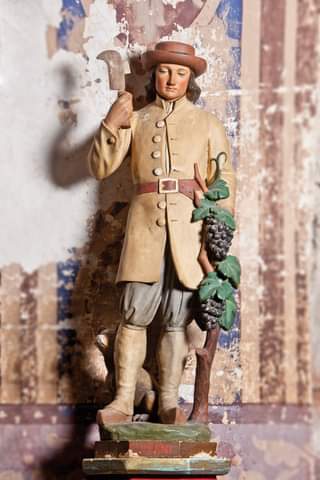 “Il y a plusieurs statues de lui dont une de saint Vernier jeune homme, vigneron: habit, chapeau, vigne. Saint Vernier, dit saint Verny en Auvergne, patron des vignerons est représenté avec l’habit traditionnel: jaquette, haut-de-chausses, jarretières, guêtres, souliers de cuir et chapeau de feutre; ses attributs: une serpette, un tonnelet de vin dit bousset, un chien couché à ses pieds, un bouquet de fruits à la main gauche, il s’appuie sur un tronc écoté”, détaille Nominis.